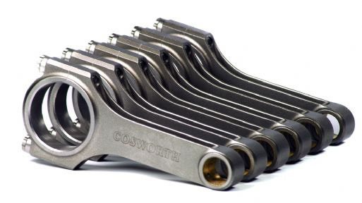 The connecting rod is the vital link between the piston and power. When engine output is increased, the demands placed on the connecting rod increase as well. To ensure engine reliability in all conditions, original connecting rods should be replaced with heavy duty specification parts. Cosworth Forged Connecting Rods are manufactured from high strength 4340 (EN24) steel and machined to exacting tolerances. Sold in a matched set of 6 rods. Specification: Strong, light weight H-beam design Heavy duty rod bolt (260,000psi) Manufactured from 4340 (EN24) steel Small end bushed for floating pin