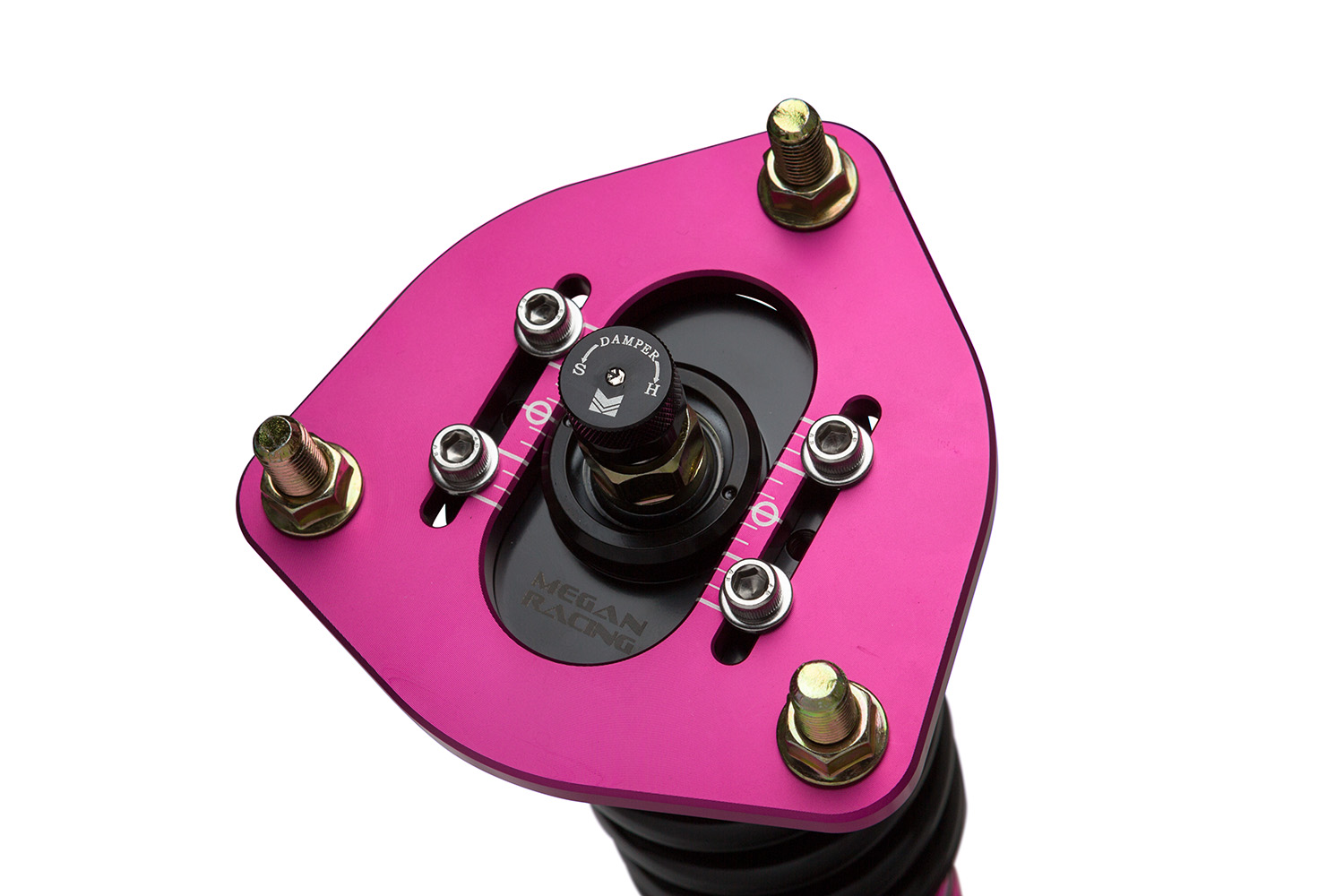 On applications utilizing strut-type suspension designs, the Megan Racing SPEC-RS Coil-over Damper Kits come with fully adjustable Pillow-Ball upper mount camber plates to easily tune and adjust your camber, giving you a competitive edge over other suspension setups. This allows you to tune your car for any ride height and still adjust camber to improve handling, vehicle predictability and tire wear, which is a great benefit both on the race-track and on the street.