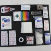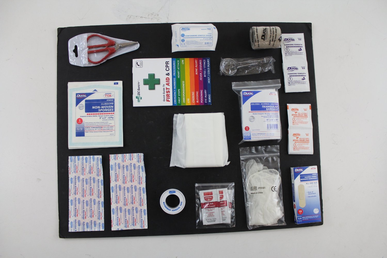 Play it safe with a first-aid kit with Velcro backing so it can secure to any carpeted surface. Basic first aid supplies in a zippered vinyl pouch. Contents include: latex free gloves, adhesive bandages, adhesive tape, sterile gauze, elastic bandage, cleansing towelettes, large grip super scissors, first aid cream, tweezers/magnifier and first aid instruction booklet.