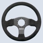The Sparco P300 steering wheel is a 300mm diameter, 3 spoke flat steering wheel trimmed in black suede with a Sparco logo. It is a competition steering wheel designed for use in saloon racing or rally cars. Supplied with horn button.