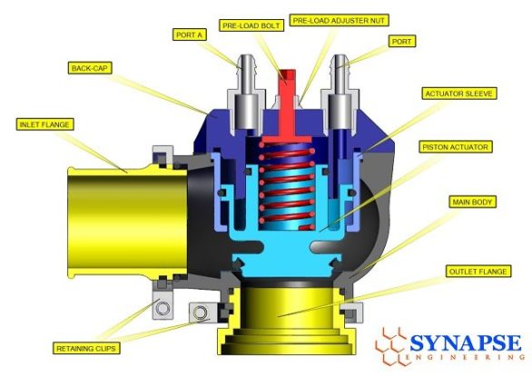 The Synchronic DV is a compact, zero-diaphragm, high-flow Diverter Valve actuating within 25 milliseconds. The DV body is near-net, investment cast, aerospace-grade Aluminium followed by CNC machining of all components including the forged 6061 actuator assembly. Each DV unit is tested to withstand 60 psi to ensure no boost leak.