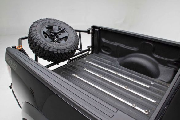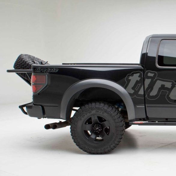 This PreRunner tire carrier allows you to haul up to a 40″ tire while maintaining your truck’s ground clearance and bed space. The TireGate is mounted directly into the factory tailgate mount positions with no cutting, drilling, or welding required (on most vehicles) *. This carrier is easy to open and can be angled either inboard or, by repositioning two pivot bolts, outboard for maximum bed space. The Tiregate opens wide to allow easy and complete access to your truck bed.