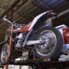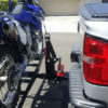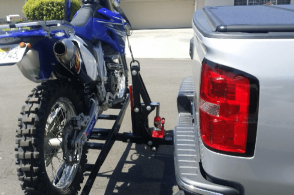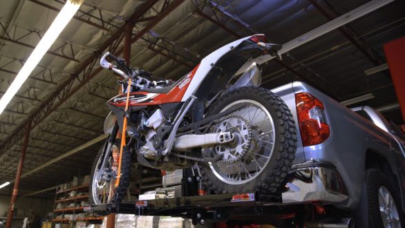This motorcycle carrier can drop its tray all the way to the ground from a 22″ hitch height and bring that load back up to the receiver hitch height of the transport vehicle.
